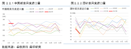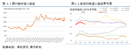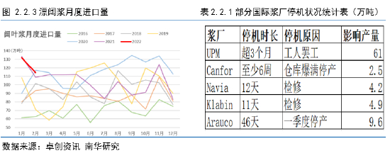 2022年以来,国际浆厂陆续传出停机检修通知。其中,加拿大由于自然灾害原因,致使浆厂仓库爆满而停机,影响产量约2.5万吨;UPM集团旗下浆厂由于工人罢工而停机,影响产量约61万吨。以上因素无不影响纸浆发运至中国。展望二季度,由于加拿大太平洋铁路公司部分员工罢工,预计或会对加拿大纸浆厂运输产生影响,进而影响纸浆进口至中国数量。另外,俄罗斯纸浆发运至中国数量或会受到影响。由于国际浆厂不可抗力陆续发生,针叶浆进口量预期或会进一步下降。