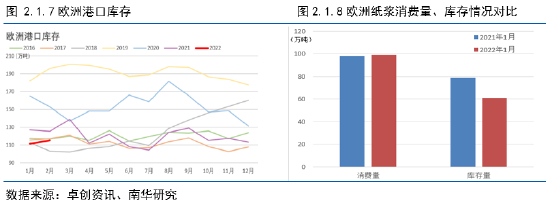 2022 年 1 月份欧洲化学浆消费量 99.72 万吨(针叶浆 33.31 万吨、 阔叶浆 65.20 万吨、本色浆 1.21 万吨),同比增加 0.92%。2022 年 1 月欧洲化学纸浆库存 量 62.78 万吨(针叶浆 22.02 万吨、阔叶浆 39.72 万吨、本色浆 1.04 万吨),同比下降 20.03%。库存天数 19 天,较去年同期下降 7 天。2022年2月欧洲港口木浆总库存为115.19万吨,环比上涨3.5%,相比去年同期水平降低8.2%。