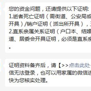 证明资料备齐后,通过在线客服提供的链接提交,如去世者的微信无法登录,也可以用家属的微信进行提交,收到资料后,腾讯客服会尽快核实处理。