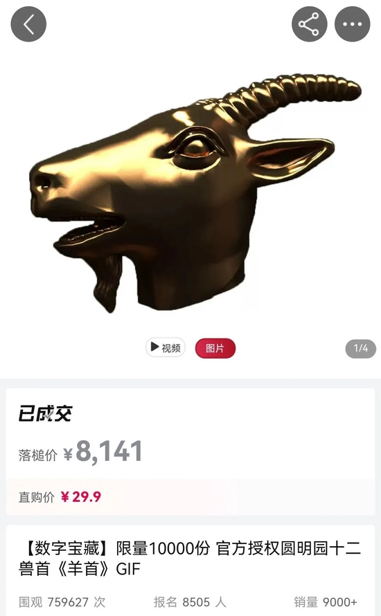近日,失踪多年的圆明园十二兽首之羊首“现身”拍卖会,落槌价格8141元。这个价格肯定买不到真文物——实际上,消费者高价买到的只是一张虚拟动图,只不过附有全球唯一编码。根据相关计划,十二兽首的虚拟动图都将在拍卖中亮相。