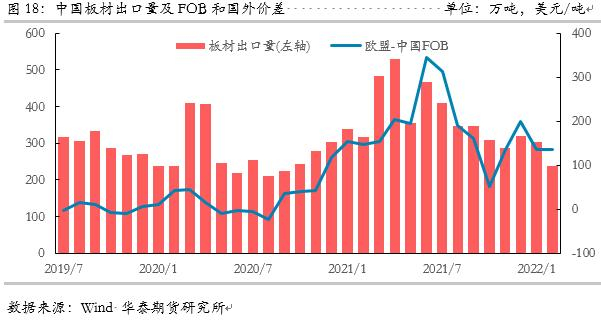 从出口利润来看,目前这一价差在450美元左右,略高于去年下半年平均水平。而FOB价和欧盟钢价价差达到了历史新高,在500美元左右。如果按照价差和出口量对比图简略粗算,目前价差水平可以环比2月份增加150-300万吨左右板材出口,或200-350万吨钢材出口。