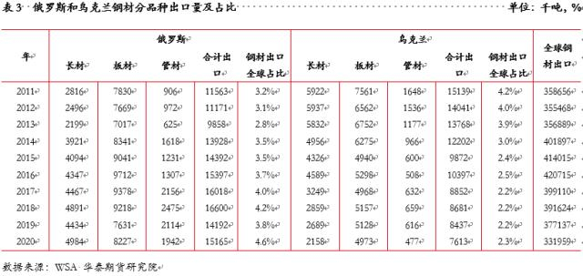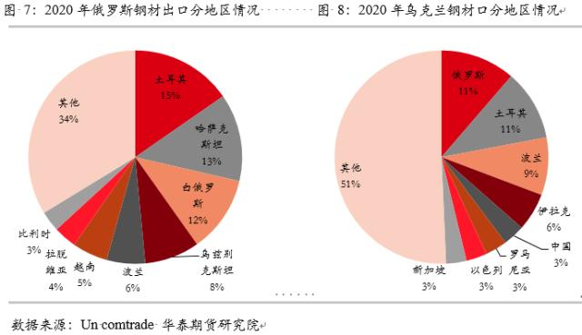 从俄乌钢材出口情况来看,2020年俄罗斯和乌克兰分别出口钢材1516.5万吨和761.3万吨,分别占全球钢材出口量的4.6%和2.3%。从出口品种来看,板材占比大幅高于长材。