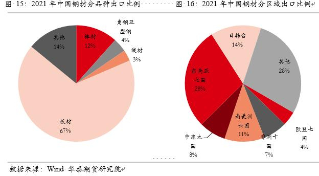 钢材的直接出口取决于国内外价差,价差越大出口动力越大。从目前来看,中国钢材出口品种中板材依然占比较高,2021年在67%左右。从出口区域来看,主要出口到东南亚、日韩台,出口到欧盟的量相对较小。