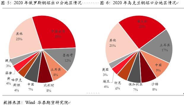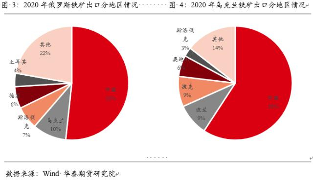 2020年俄罗斯和乌克兰铁矿出口量分别占全球铁矿总出口量16亿吨的1.6%和2.9%。中国均是俄罗斯和乌克兰最大的铁矿出口目的地,除此之外大多出口到欧洲地区。可见,一旦铁矿出口受阻,中国将首当其冲,受影响最大。