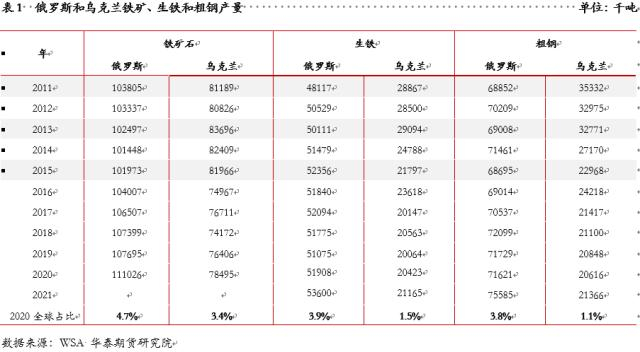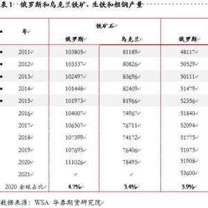 【摘要】俄罗斯和乌克兰是全球重要的铁矿和钢材生产大国,俄乌铁矿产量合计占全球产量的比重在8.1%,而生铁和粗钢的占比则分别为5.4%和4.9%。