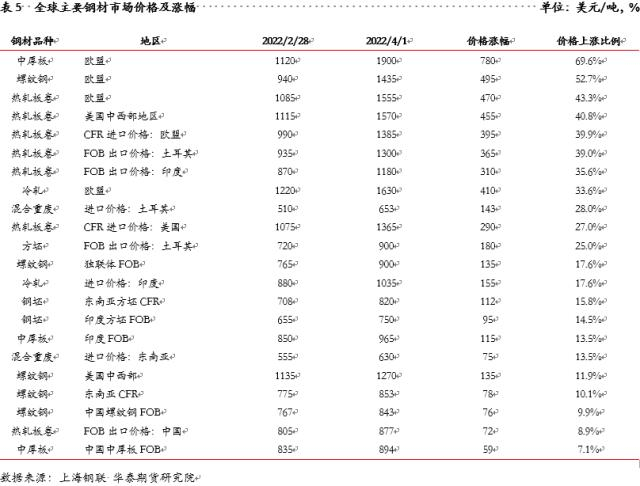 目前来看,从俄乌战争爆发至今,欧盟钢价涨幅最高,其中中厚板、螺纹钢和热卷分别上涨了69.6%、52.7%和43.3%,位列全球钢材产品上涨幅度的前三。受此影响,美国、土耳其、印度等地钢材价格上涨幅度也多在10%以上。中国国内以上海为例,热卷和螺纹钢现货价格分别上涨了290和240元/吨,合5.9%和5.0%。