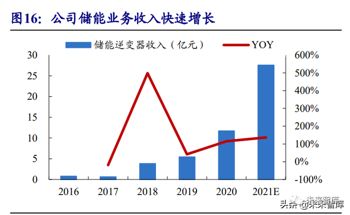 2021 年公司变流器产品收入增长。公司依托于多年的变流器研发技术积累及优势, 已成功研发并推向市场成熟的储能变流器产品,目前处于“商业化初期向规模化发 展”阶段, 受益于户用储能市场的快速发展,公司 2020 年储能变流器实现营业收 入 0.37 亿元,业务收入占比约 1.79%,同比增长 115.4%。2021 年公司储能业务发 展迅速,仅上半年营收达 0.66 亿元,同比增长超 640%,收入占比升至 4.57%。