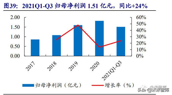 公司前期研发投入较多,2018、2019 年,公司净利润分别为 0.2 亿元、0.06 亿元。2020 年以后,公司新业务带来业绩增量,公司业绩表现改善。2020 年公司营收达 5.75 亿元(同比+57%),公司归母净利润达 0.57 亿元(同比+1325%)。2021 年前三季度, 公司营收达 5.72 亿元(同比+44%),公司净利润达 0.73 亿元(同比+40%)。