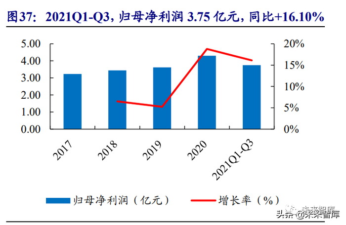 公司稳健经营,盈利能力不断增强。2020 年,公司实现营收 25.25 亿元,同比增长 11.18%;归母净利润为 4.30 亿元,同比增长 18.78%。2021 年前三季度,公司营收为 25.76 亿元,同比增长 54.34%;归母净利润为 3.75 亿元,同比增长 16.10%。