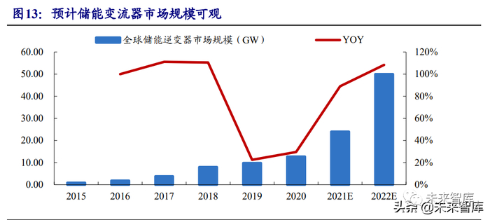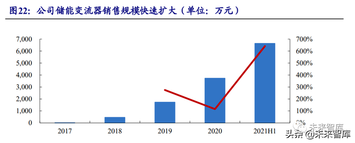 微型变流器业务发展迅速。公司作为光伏逆变器新秀,现有产品包括微型变流器、组 串式变流器、储能变流器等类型,目前公司变流器已销往巴西、南非、美国、印度、 波兰、巴基斯坦等 40 多个国家和地区。储能变流器的高毛利也使得其成为公司重点 发展的产品。2021 H1 公司变流器业务实现营收 3.79 亿元,其中储能变流器销售收 入约 1.8 亿元,同期增长 285.62%,产品销量约 2.62 万台,储能收入占比已升至 47.5%。(报告来源:未来智库)