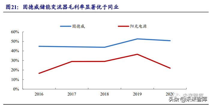 固德威的光伏储能变流器主要针对小型户用市场,以降低用户对电网和传统能源的 依赖,实现家庭电力的自给自足。2020 年固德威储能变流器出货量约为 2.23 万台, 营业收入达 1.59 亿元,同比增长 47%,业务收入占比约为 9.99%。固德威户 用储能变流器市场占比超 15%,全球排名第一。此外,由于公司储能产品多销往国 外,毛利率显著优于同业约 10~30pct。