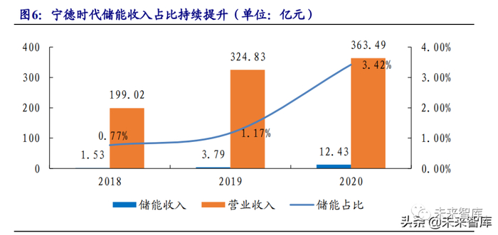 龙头宁德时代储能领域布局较早收货颇丰。作为国内锂电龙头企业,宁德时代 2011 年就开始布局储能产业,参与河北张北国家电网风光储输示范项目;2016 年,参与北 京国贸大厦用户侧商业储能充电项目与青海格尔木商业储能项目;2019 年,公司与星 云股份成立时代星云,涉及储能用 BMS、系统集成等研发和生产,之后公司合作设 立了多家储能相关子公司。2020 年宁德时代储能业务收入占比不断上涨,宁德时代 不仅在动力电池领域保持第一,而且 2020 年储能电池出货量突破 2.8GWh,排名世 界第三,国内第一。2021 年宁德时代储能电池出货量预计在 15-20GWh 之间。