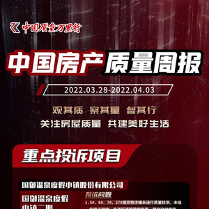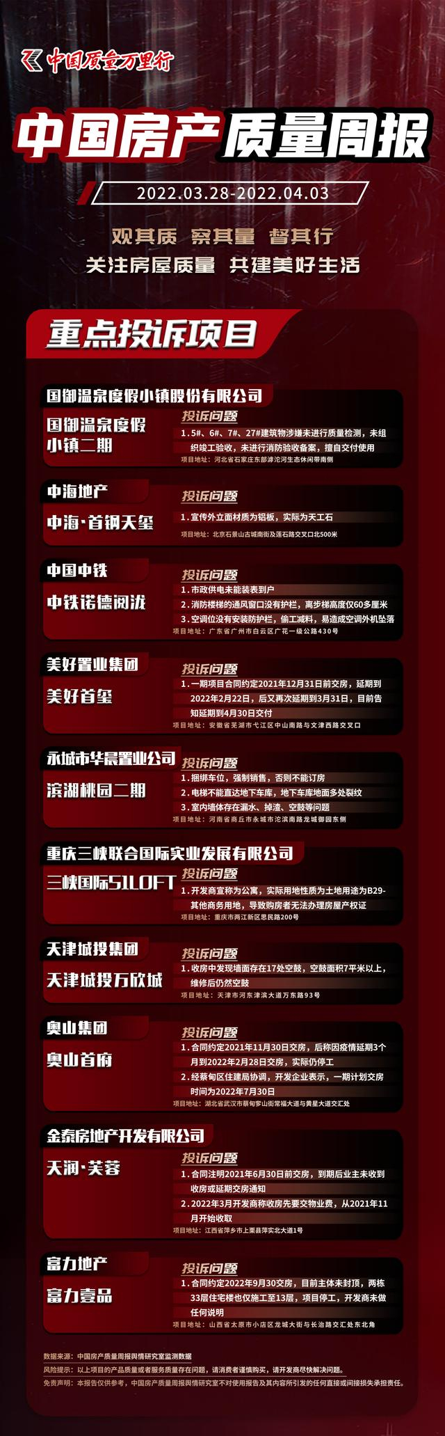 2022年3月28日-4月3日,中国质量万里行共收到110条业主投诉信息,加上网络监测的舆情数据,最终整理出10个需要重点关注的问题项目。具体来看,本周重点投诉项目涉及的开发商包括国御温泉度假小镇股份有限公司、中海地产、中铁置业、美好置业集团、永城市华晨置业公司、重庆三峡联合国际实业发展有限公司、天津城投集团、奥山集团、金泰房地产开发有限公司以及富力地产。涉及的项目分别是国御温泉度假小镇二期、中海?首钢天玺、中铁诺德阅泷、美好首玺、滨湖桃园二期、三峡国际51LOFT、天津城投万欣城、奥山首府、天润?芙蓉和富力壹品。