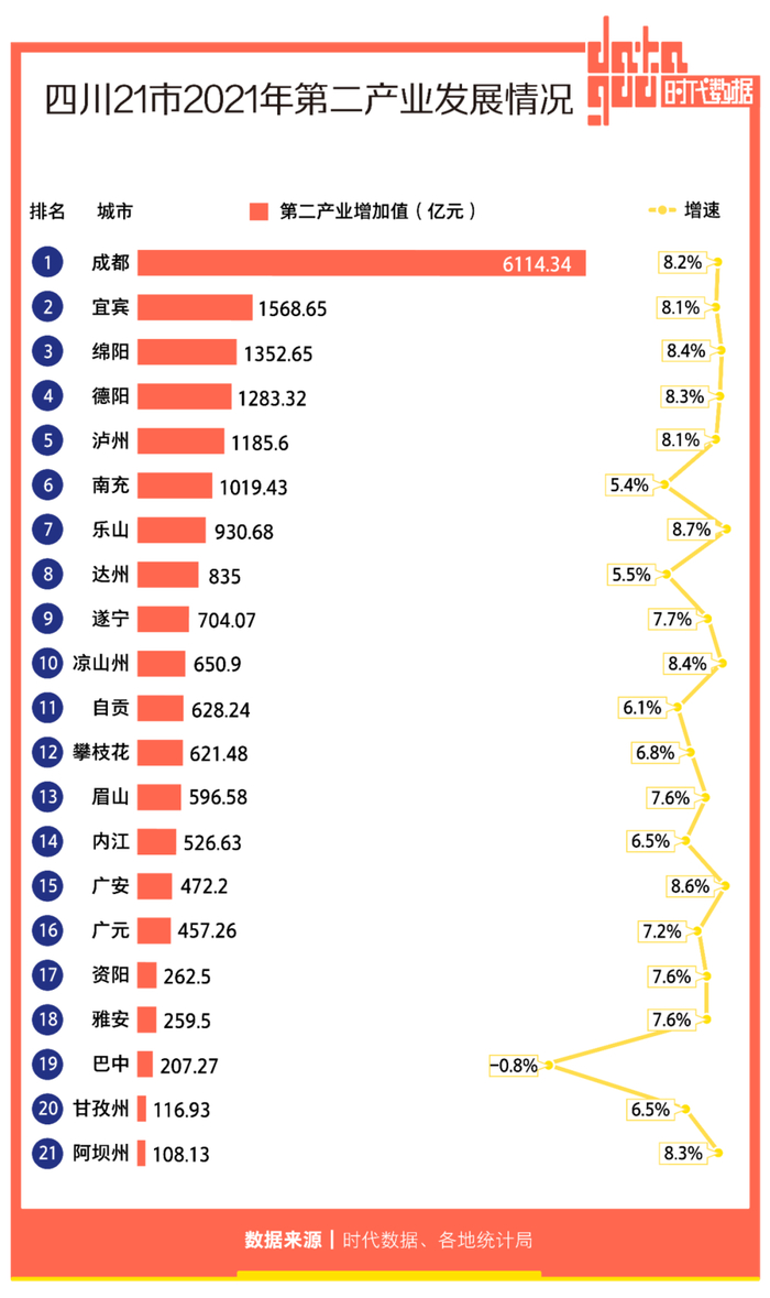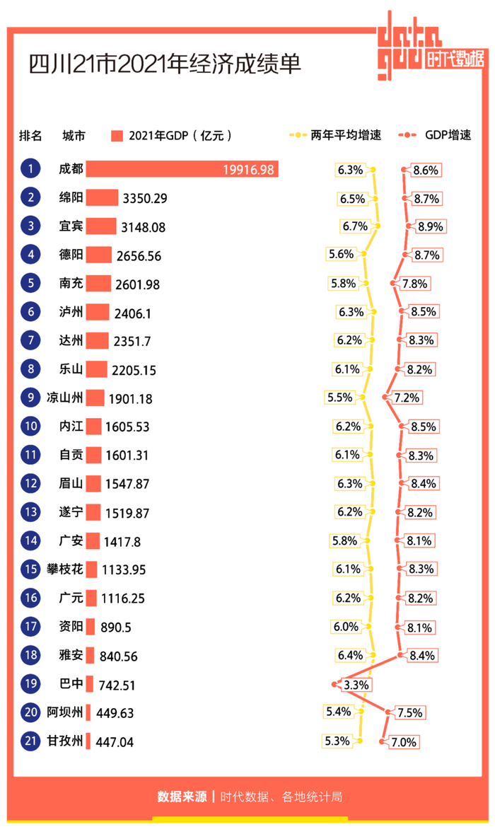 本文来自微信公众号:时代数据 (ID:datagoo),作者:张照,编辑:张照,设计:梁海虹,原文标题:《四川21市2021年经济成绩单:成都GDP全省第一,宜宾增速亮眼,6城人均GDP超1万美元》,头图来自:视觉中国