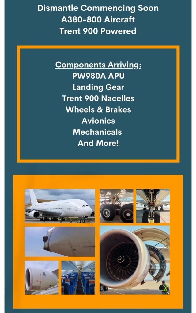 Jet Midwest公司在官方公告中表明,即将开始拆解的南航A380-800客机,拆解的零部件包括但不限于辅助动力装置、起落架、轮胎和刹车、航电设备等等。