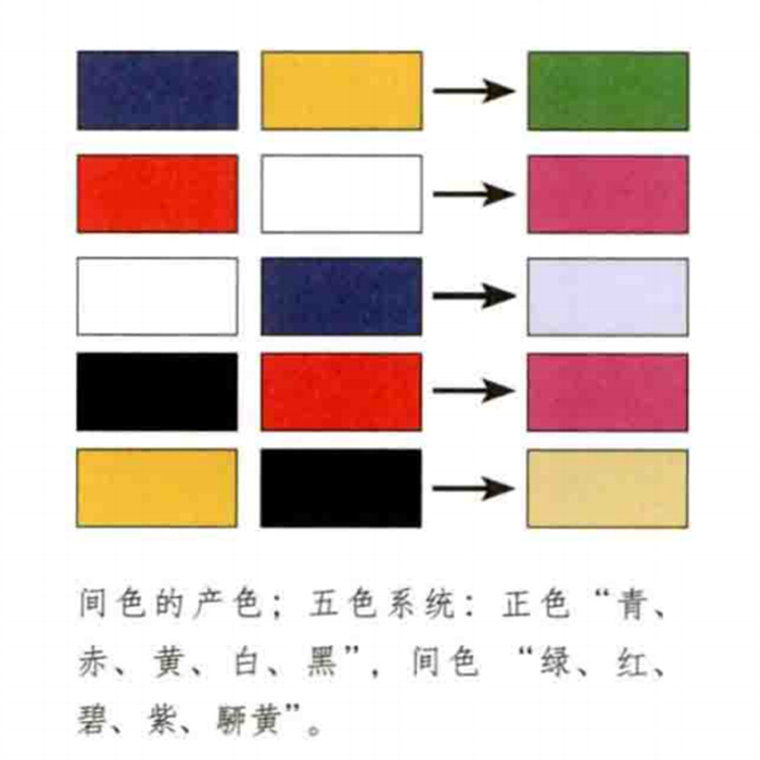 五正色两两相配,成五间色。后来“间色”可以指称除了五正色之外的所有颜色,且“间色”在历史中也不断推陈出新,充满活力。
