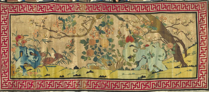 故宫博物院藏,金银线地“玉堂富贵”栽绒壁毯 其中可见各种绿色的色相表现。