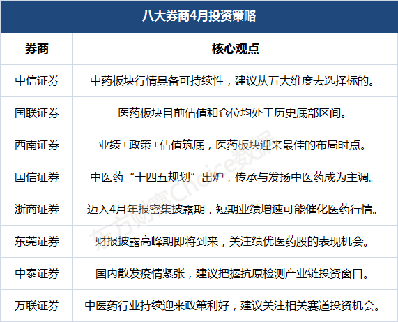 【八大券商主题策略:中药板块行情具备可持续性!五大维度布局产业链标的】国联证券表示,医药板块目前估值和仓位均处于历史底部区间,随着年报、一季报持续披露,高景气行业赛道有望率先反弹。