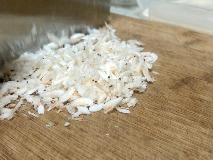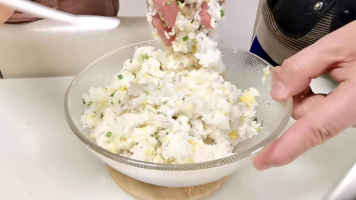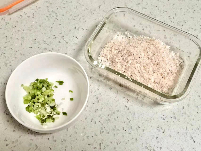 2、煮熟的米饭里根据自己口味加适量盐、葱花、虾皮等充分拌匀。(虾皮切碎可以多放一点,根据自己口味添加)
