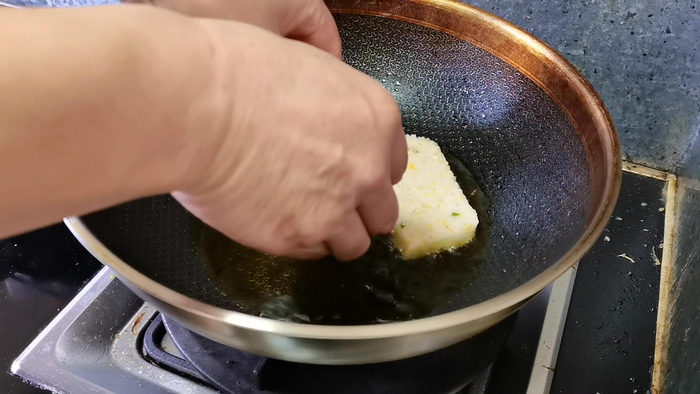 7、平底锅里倒少许油烧热,放入粢饭糕。