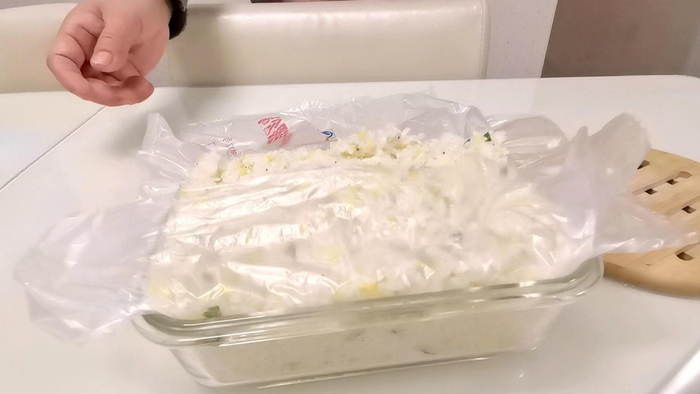3、长方形容器里铺上保鲜膜,将米压实摊平。(可以用烤盘,没有的话就直接铺在保鲜膜上整形)
