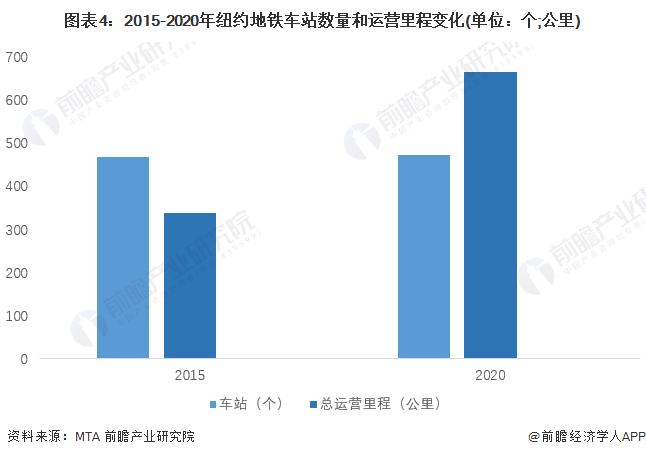 2015-2020年,纽约地铁车站数量和运营里程数量呈不断上升趋势,2020年,纽约地铁车站数量为472个,地铁总运营里程数为665公里。