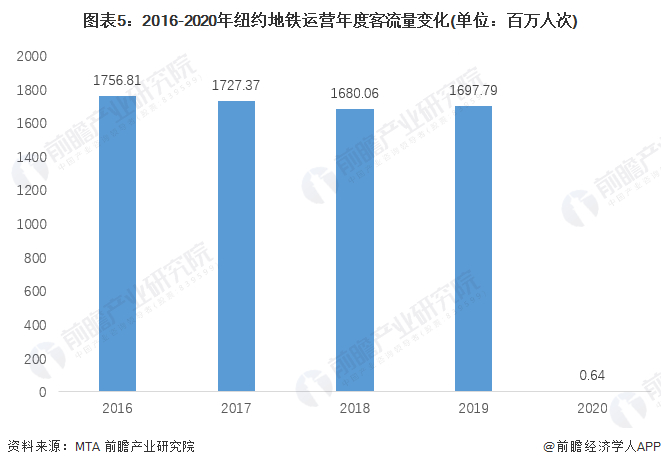 纽约作为目前全球范围内最繁华的都市之一,其地铁客流量较大为全球最繁忙的十大地铁站之一。2016-2019年,纽约地铁年度客流量在1600百万-1800百万人次之间,2020年,受疫情影响,纽约地铁客流骤减,下降至0.64百万人次。其中,纽约地铁最繁忙的车站包括时代广场 42 街、Grand Central-42 街、34 圣先驱广场、14 街联合广场以及富尔顿街。