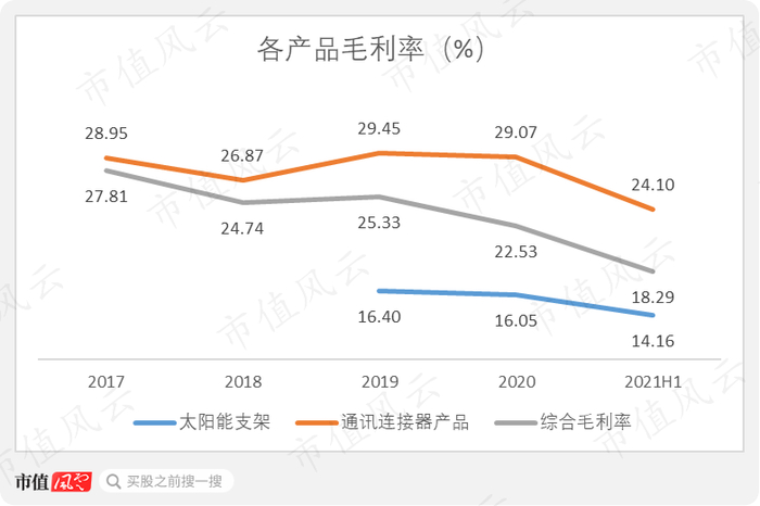 2020年,意华股份通讯连接器产品的毛利率为29.07%,而太阳能支架的毛利率仅有16.05%,当年的综合毛利率也因此下滑了近3个点。