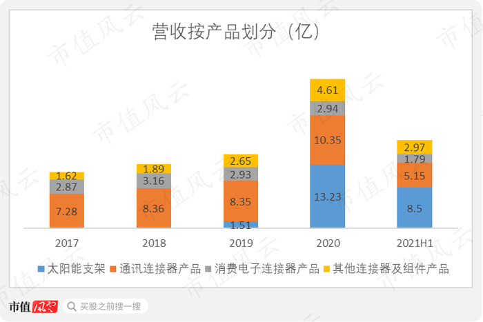 意华新能源主营太阳能跟踪支架,2020年,单是太阳能支架业务就贡献了营收13.23亿,占总营收的四成。