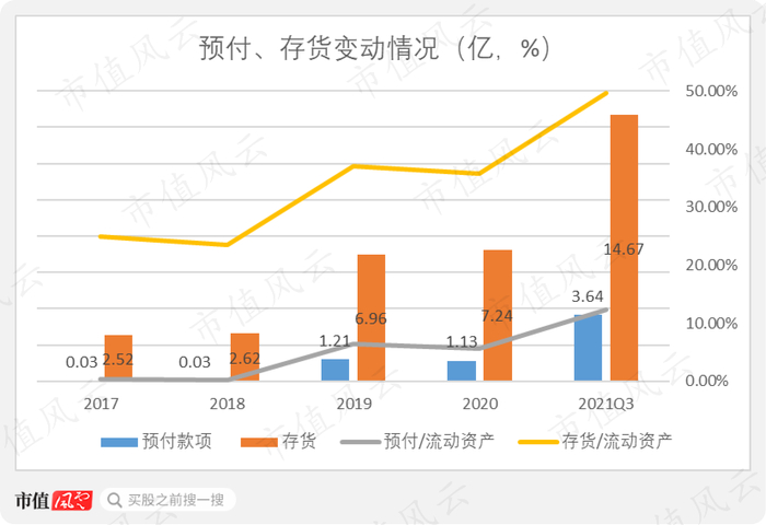 并购后,2019年底,意华股份预付账款由300余万激增至1.21亿。截至2021年9月末,意华股份预付账款增加至3.64亿,占流动资产的12.31%。