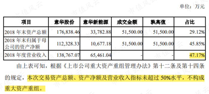 不过,2018年意华新能源的营收占上市公司的47.17%、归属于母公司的资产净额占比达45.85%,可以说就是卡着重大资产重组的线在操作。