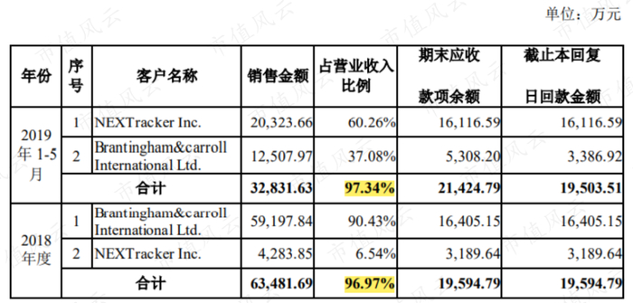 2018年、2019年1-5月,意华新能源向NEXTracker和BCI销售额占总营收的97%左右。