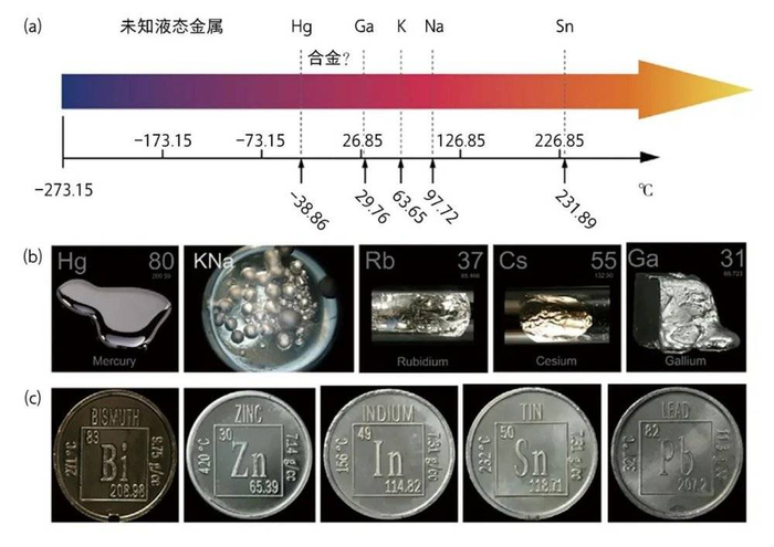 元素周期表中常温单质液态金属及其可组成常温液态合金的金属 (a)处于不同温区的潜在液态金属;(b)常温液态金属;(c)液态金属组元。