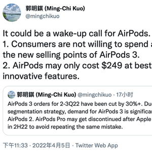 最近,围绕AirPods砍单的瓜一波接着一波。昨夜,天风国际分析师郭明錤发Twitter爆料称,2022年第二、三季度的AirPods订单已削减超30%。他认为“这可能会为AirPods敲响警钟”。