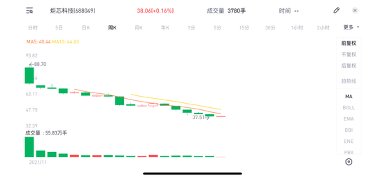 炬芯科技于2021年11月上市,与其他几家企业相比,其上市时间较短,但其今年股价跌幅已达到35.98%,其上市当天,股价就达到了最高点88.70元/股,半年时间,其股价一路下滑,今日收盘价为38.06元/股。