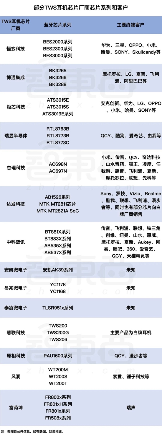 ▲部分TWS耳机芯片厂商蓝牙芯片系列和终端品牌客户