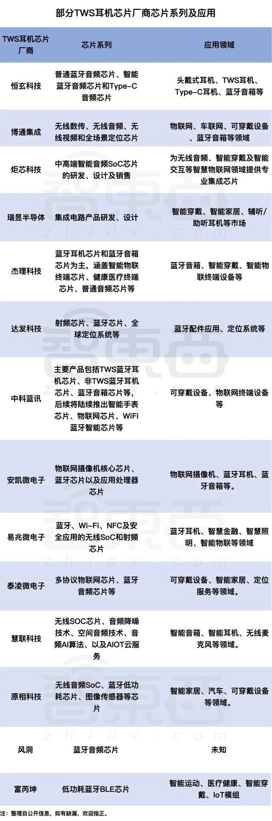 ▲部分TWS耳机芯片厂商芯片系列及应用