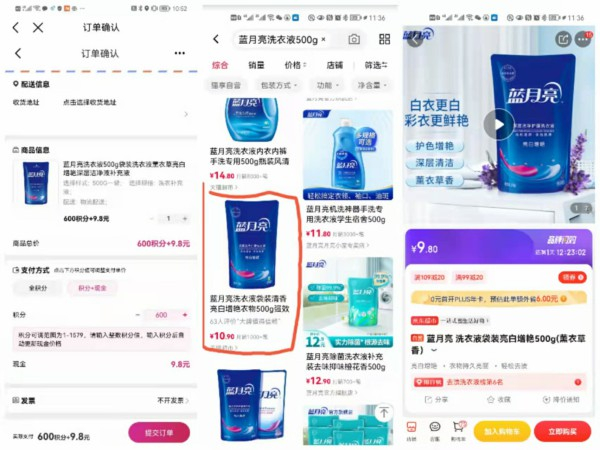 这样的价格是否实惠呢?《中国消费者报》记者在其他电商平台上寻找同款商品进行了比价。在蓝月亮京东自营旗舰店,同款500克洗衣液补充液的价格是9.8元;在天猫超市,同款500克洗衣液补充液的价格是10.9元。