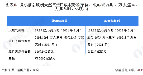 以天然气为例分析能源供应危机对欧洲能源价格的影响。2021年欧洲进口的天然气能量约为609213.7万兆瓦时,结合TTF的天然气期货结算价格计算可得,如果欧洲维持当前的天然气进口量,欧洲能源危机导致的价格上涨会使欧洲每年天然气进口成本增加约7000亿欧元。