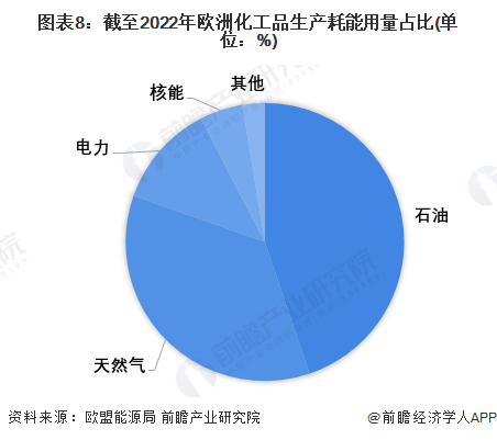 根据欧盟能源局发布信息,欧盟27国在化工品生产耗能方面,石油、天然气的用量占比分别为44.8%,35.6%,由此推至欧洲化工品对俄罗斯能源依赖程度强。