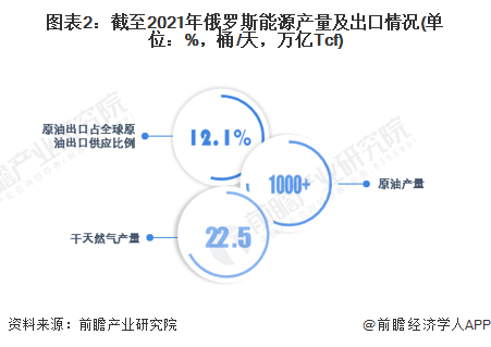 俄罗斯还是世界第二大的干天然气国家,世界第三大石化、油气等能源产出国。截止2021年底,俄罗斯原油出口占全球原油出口供应的12.1%左右,原油产量超过1000万桶/天,每年生产超过22.5万亿Tcf的干天然气。
