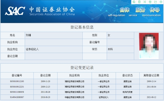 决定书显示,刘瑾于2009年10月26日至2018年6月15日就职于湘财证券库尔勒人民东路证券营业部,先后任财务经理、客户经理职务。2018年8月1日至2021年8月12日,刘瑾就职于华融证券库尔勒文化路证券营业部,为证券经纪人。