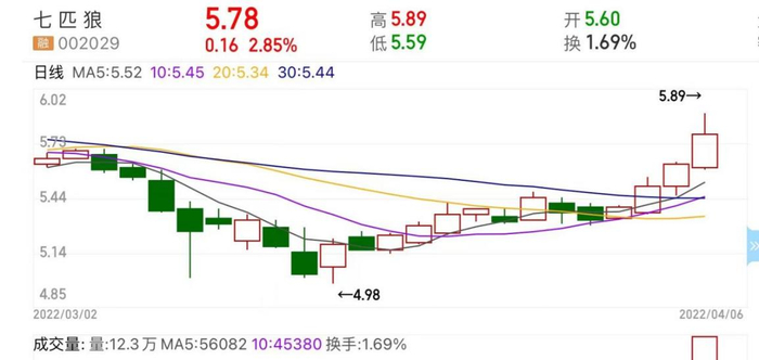 而七匹狼的短期股价走势也较为强势,4月6日其股价上涨2.85%,收报5.78元,仍在继续上探短线压力位5.89元。