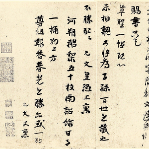 《病久帖》释文:允文病久,气羸,多卧少行立。执笔作此,书不成字,简礼文甚矣。□□赐书,只乞草圣一帖。既心示相亲,又将为子孙百世之藏也。不胜恳恳。允文皇恐上禀。河朔鹅梨五十枚,南诏余甘子一桶,纳上方尊俎,报答春光之胜,亦或一助。允文又禀。