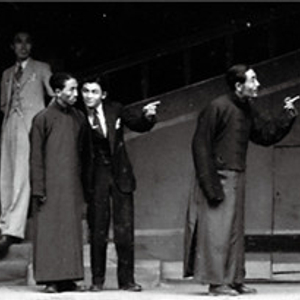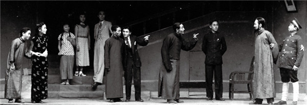 1942年《伪君子》演出第五幕(人物从左至右:白母、爱密、杜瑞英、玛瑞、伍乐如、葛赖阳、达米、白遏刚、科长、戴度甫、巡警)