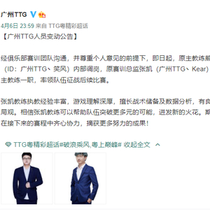 6日晚,广州TTG发布公告,宣布原主教练熊云鹏(ID:笑风)内部调岗,不再继续担任队伍主帅,广州TTG赛训总监张凯(ID:Kear)出任队伍主教练,带领队伍继续征战。