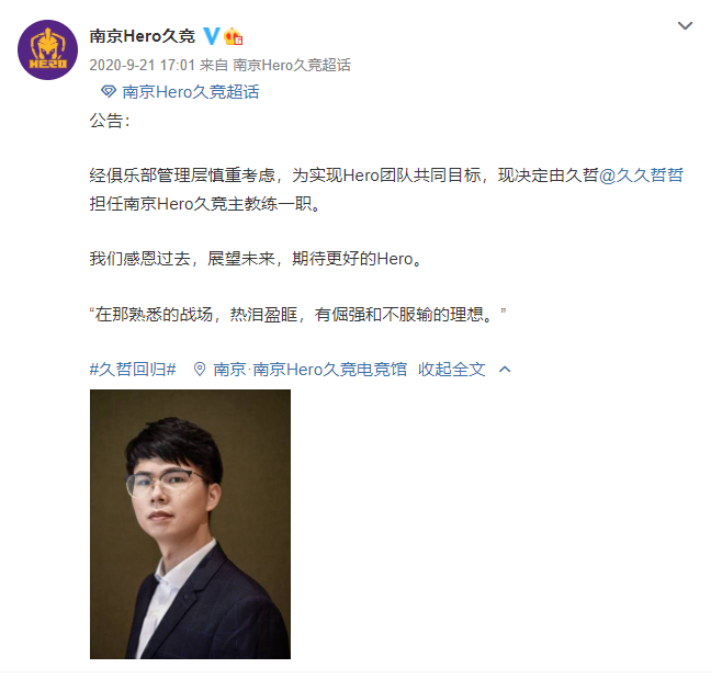 久哲最第三次复出,是2020年秋季赛,队伍搬到南京后,他接替了黄秉承(ID:Yellow),虽然2020年秋季赛季后赛他带队不敌杭州LGD大鹅,但在之后的冬冠、2021 KPL春季赛,久哲带领南京Hero久竞连夺两冠实现复兴。有一些声音认为,久哲第三次复出的成功,在于队伍选手“牌”凑齐了,无畏租借期满回归,清融、星痕的登场,以及从转会市场买来子阳等等,言外之意是久哲看到“时机成熟”才选择复出,他带队有方的功劳不是特别大。但实际上,这种论调经不起推敲,做出让清融从“野亡”转型中路这一决定的,正是久哲,并且他能在众多青训苗子和转会市场中选出星痕、子阳,也是慧眼识珠,“事在人为”这一道理,在电竞赛场同样适用。