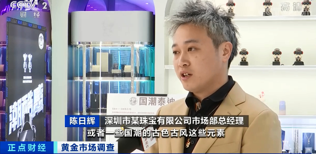 深圳市某珠宝有限公司市场部总经理 陈日辉:和去年同期相比,增长了1.5倍的销量,我们最近旗下一些国潮IP的品牌,抓取金木水火或者一些国潮的古色古风元素,把产品更加时尚化,现在特别明显的是90后和00后已经成为整个消费群体的主力,国潮IP的销售占据整体30%左右的销量。