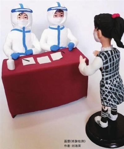 各种抗疫题材作品在源源不断地创作出来,每一件作品都饱含艺术工作者的心声,“一起战‘疫’,共克时艰”。面塑作品《核酸检测》的作者刘海英告诉记者,“每次去做核酸检测,最深的感受就是医护人员和志愿者太辛苦了,而且特别热情有耐心,我打心眼里敬佩他们,就想创作一个作品向他们致敬。”