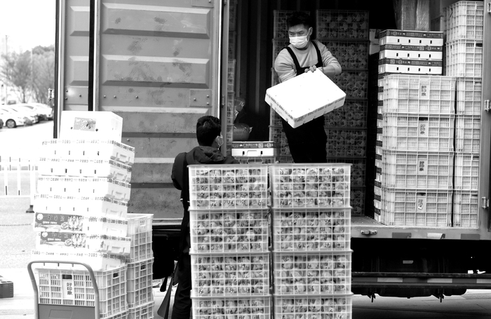 “蘑菇小篮25元,大篮45元,今天一共运了500多斤来卖。”摊主徐艺伟是嘉兴市金秋生态农业有限公司负责人,以前该农场每天供应市场的蘑菇有3000多斤,现在因为疫情出现了滞销的现象。“蘑菇的保质期很短,要是没有及时卖掉就会全部烂了。原先政府也帮我销售出去一部分,现在有了这个家门口的临时批发市场就更加方便了。”